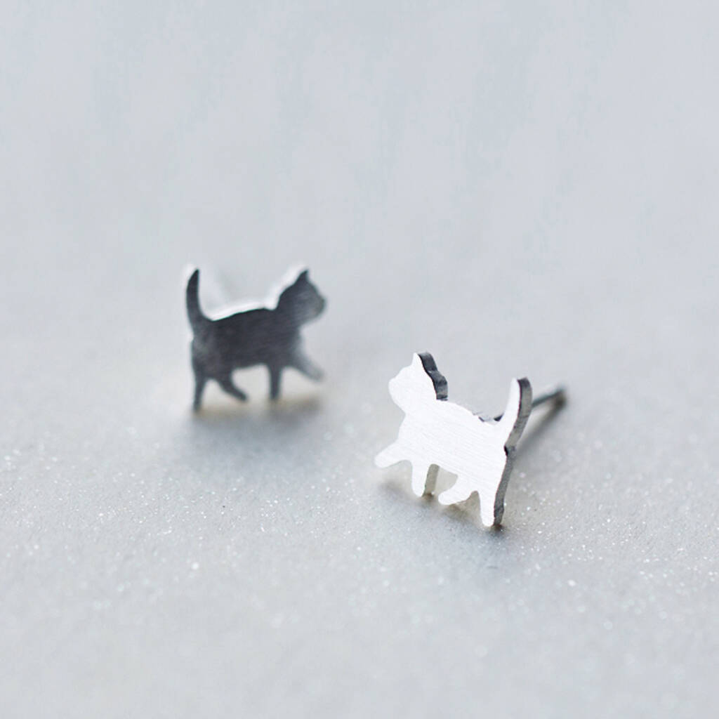 These dainty stud earrings are made of quality sterling silver with a brushed finish and come with butterfly backs. They feature a silhouette design of a walking cat.