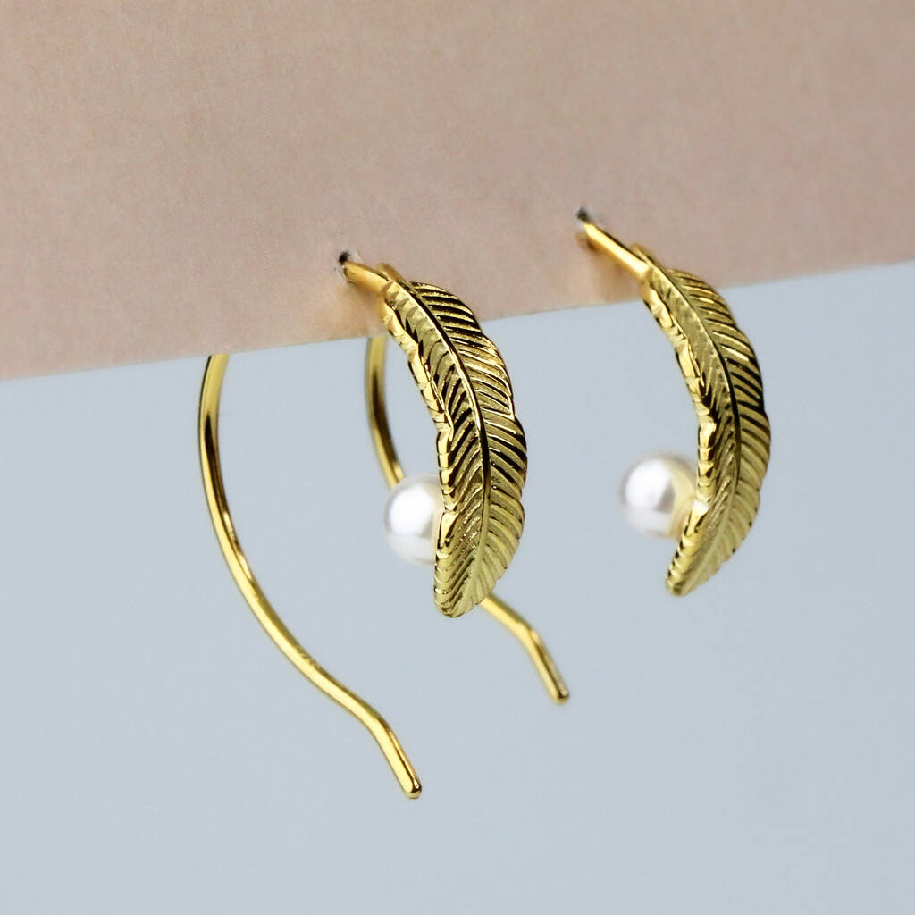 These delicate hoop earrings are made of quality sterling silver. They feature a thin open hoop with a feather design at the front which holds a single round pearl.