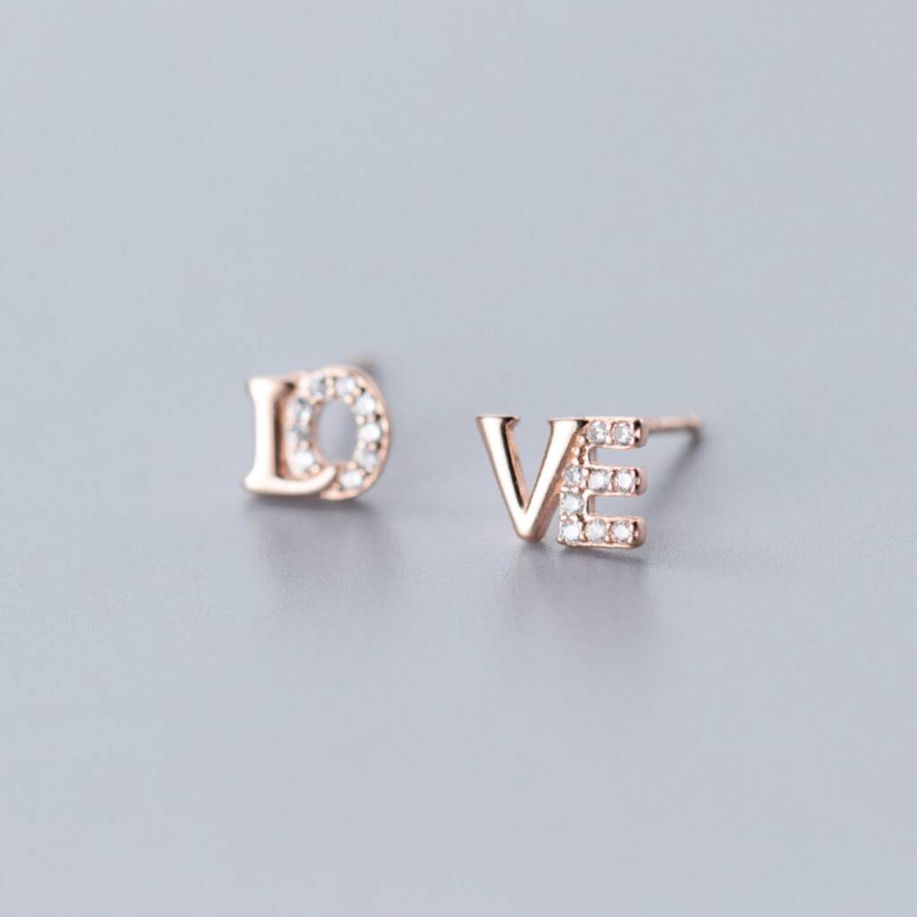 These dainty stud earrings are made of quality sterling silver and come with butterfly backs. They feature an asymetrical design that spells out 'love', with tiny white crystals.