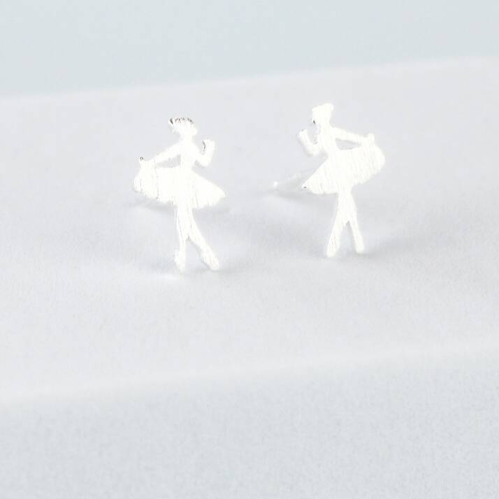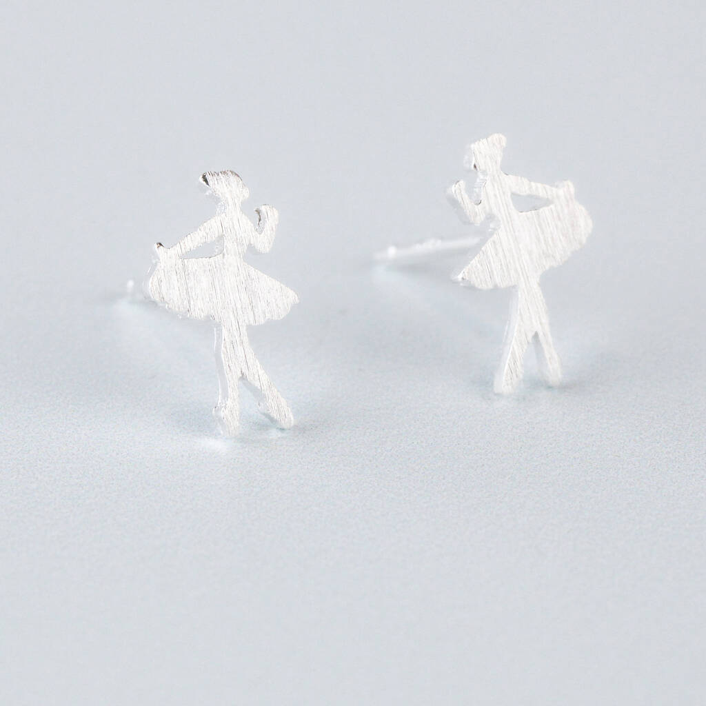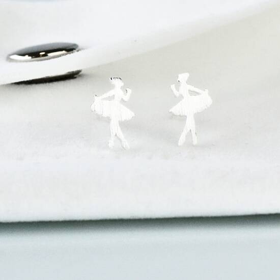 These tiny stud earrings are made of quality sterling silver with a brushed finish and come with butterfly backs. They feature a simple silhouette design of a dancing bellerina.