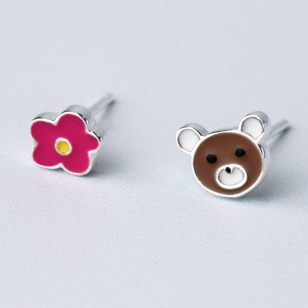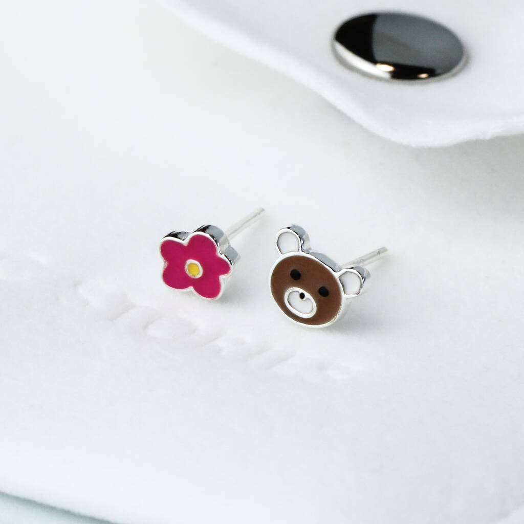 These cute stud earrings are made of quality sterling silver and come with butterfly backs. They feature a cartoon design of one pink flower and one brown teddy bear face.