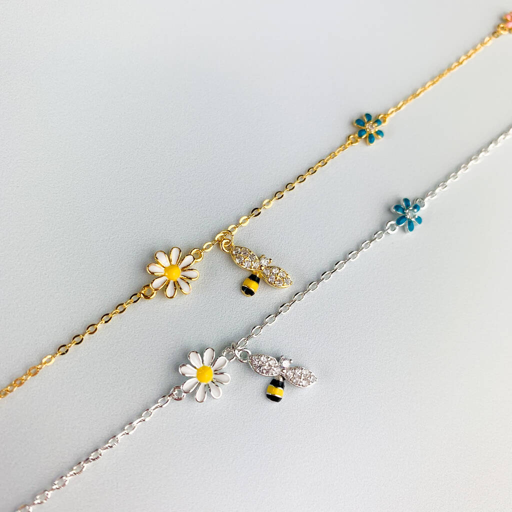 Sterling Silver Bee And Flower Charm Bracelet