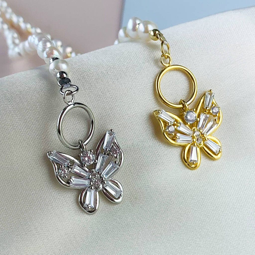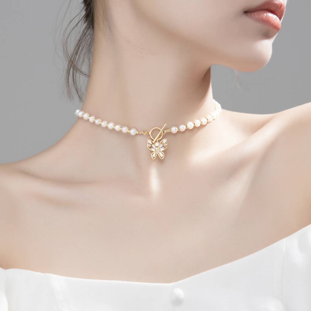 Sterling Silver Butterfly Pendant Pearl Choker Necklace
