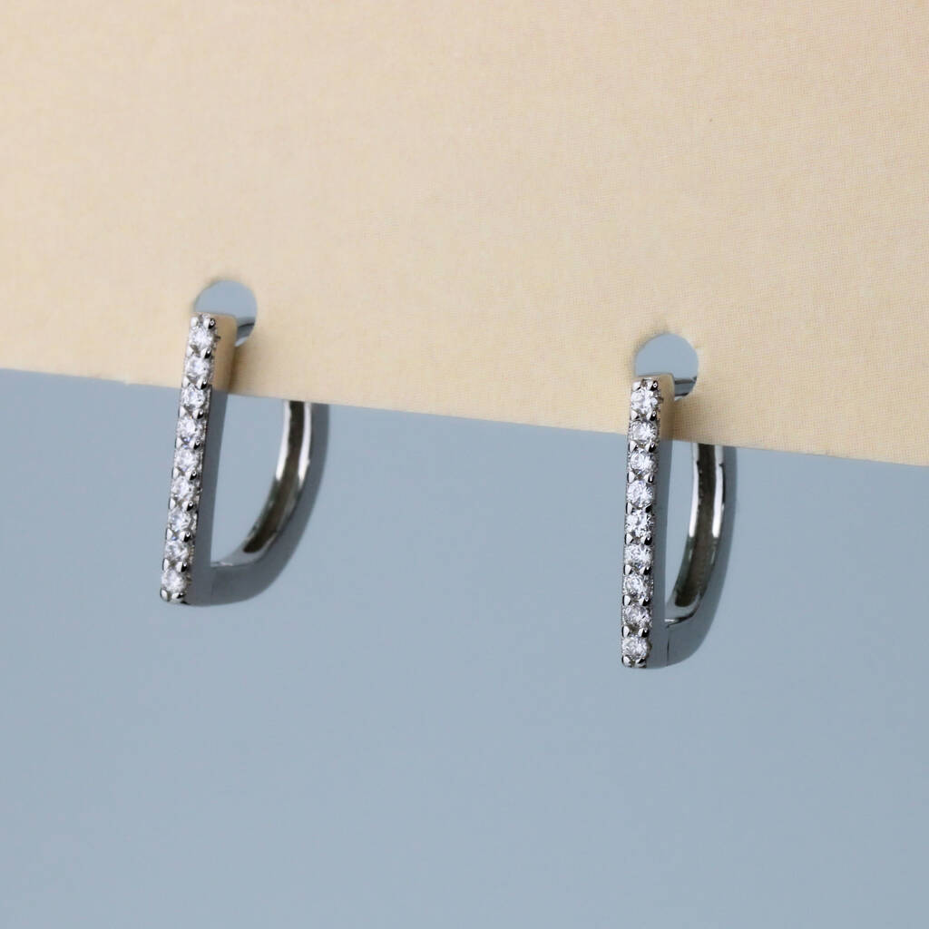 These small hoop earrings are made of quality sterling silver and have a hinged snap fastening. They have a flat bar with tiny white crystal details at the front.