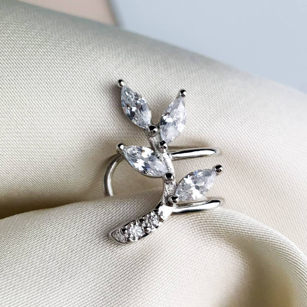 This dainty ear cuff is made of quality sterling silver and can be gently adjusted for a better fit. It features a leafy branch design with white crystal details.