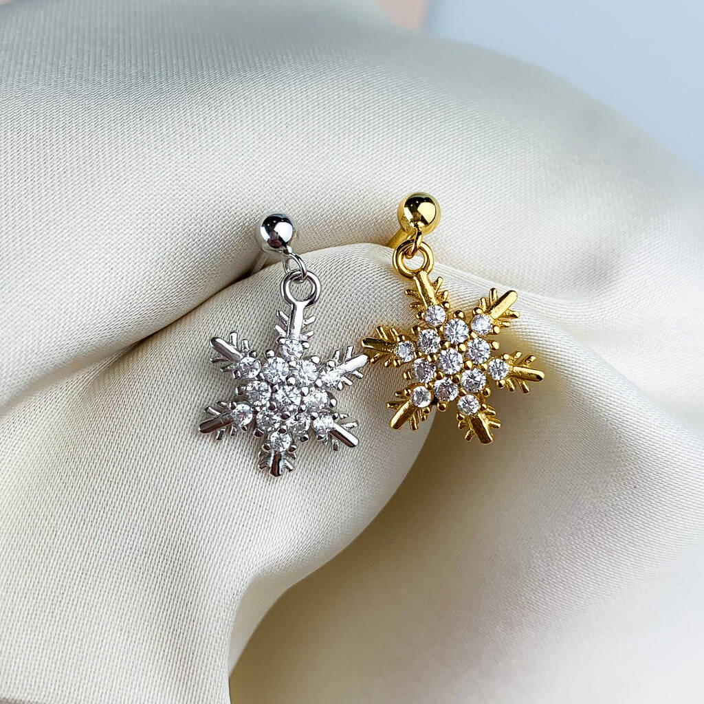 These cute stud earrings are made of quality sterling silver and come with butterfly backs. They feature a small dangling snowflake with tiny white crystal details.