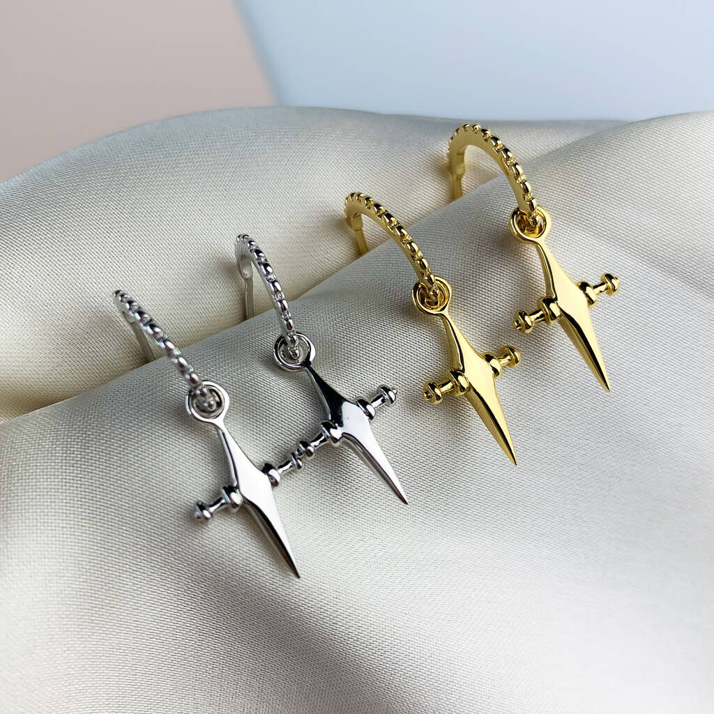 Sterling Silver Dagger Cross Dangle Hoop Earrings