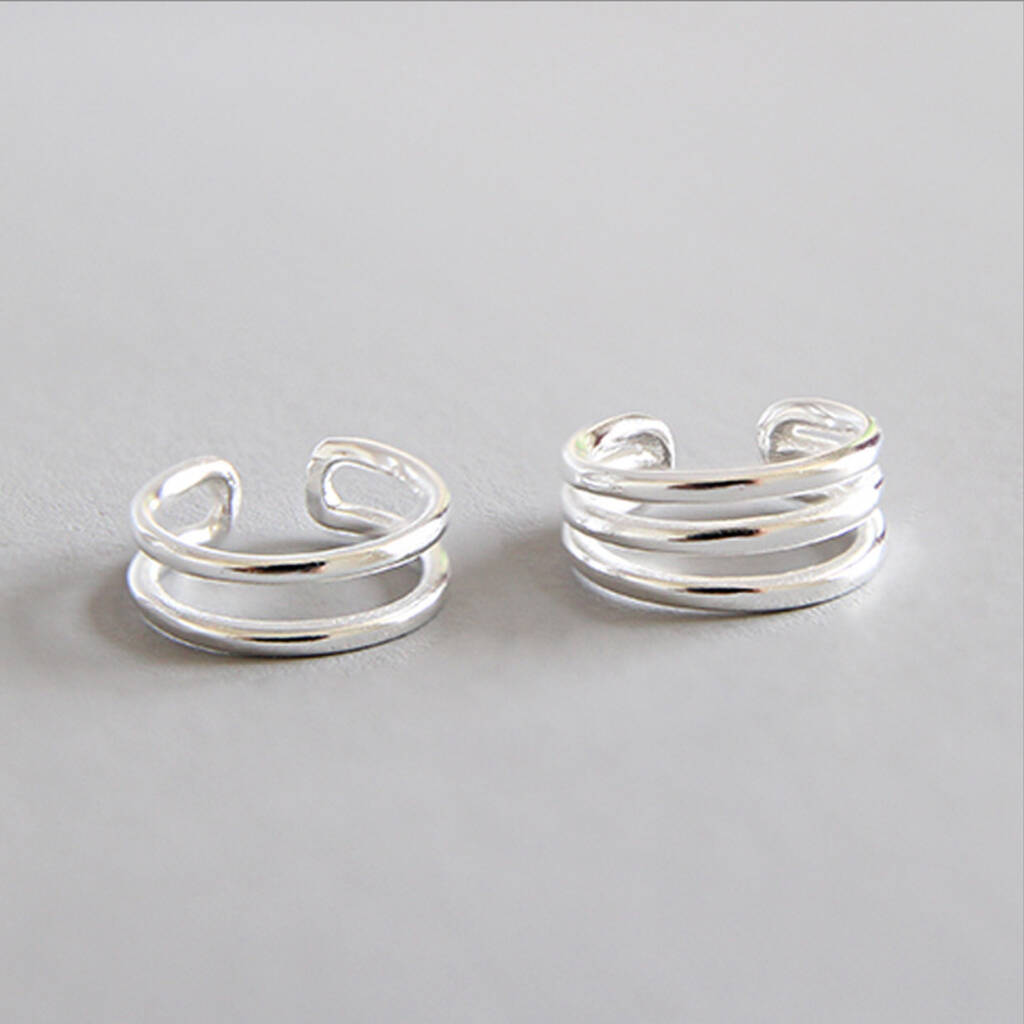 These minimalist ear cuffs are made of quality sterling silver and can be gently adjusted for a better fit. They are available with two or three bands.