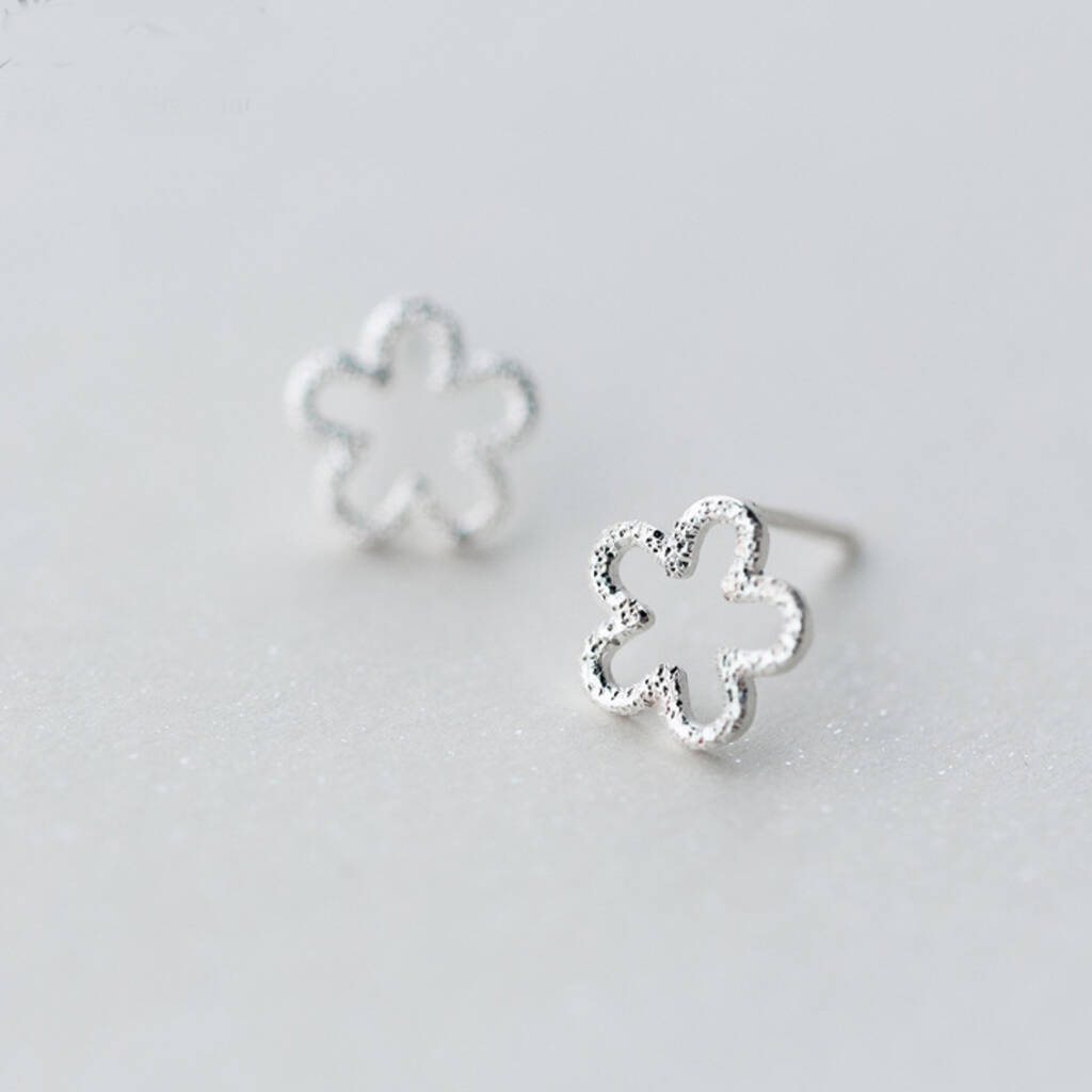 These simple stud earrings are made of quality sterling silver and come with butterfly backs. They feature a rounded outline of a flower with a textured finish.