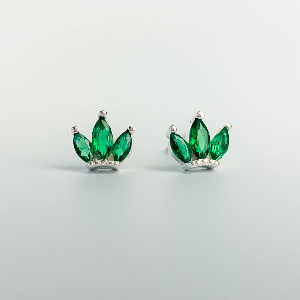 These small stud earrings are made of quality sterling silver and come with butterfly backs. They feature three pointed green crystals in a crown design.