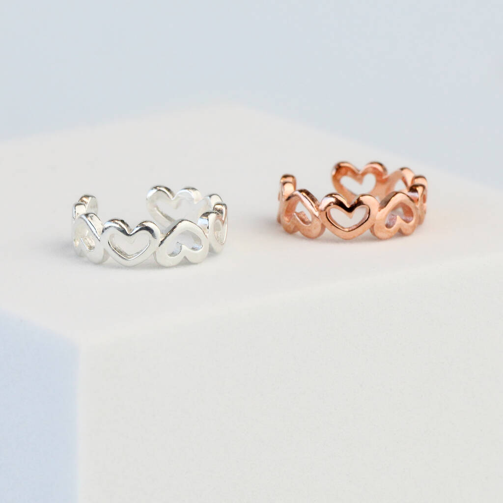 This dainty ear cuff is made of quality sterling silver and can be gently adjusted for a better fit. It features a line of hearts in alternating directions.
