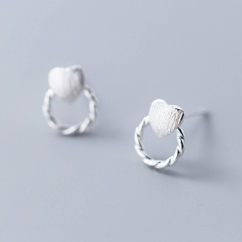 These dainty stud earrings are made of quality sterling silver with a textured finish and come with butterfly backs. They feature a door knocker design with a heart or star above a twisted circle.