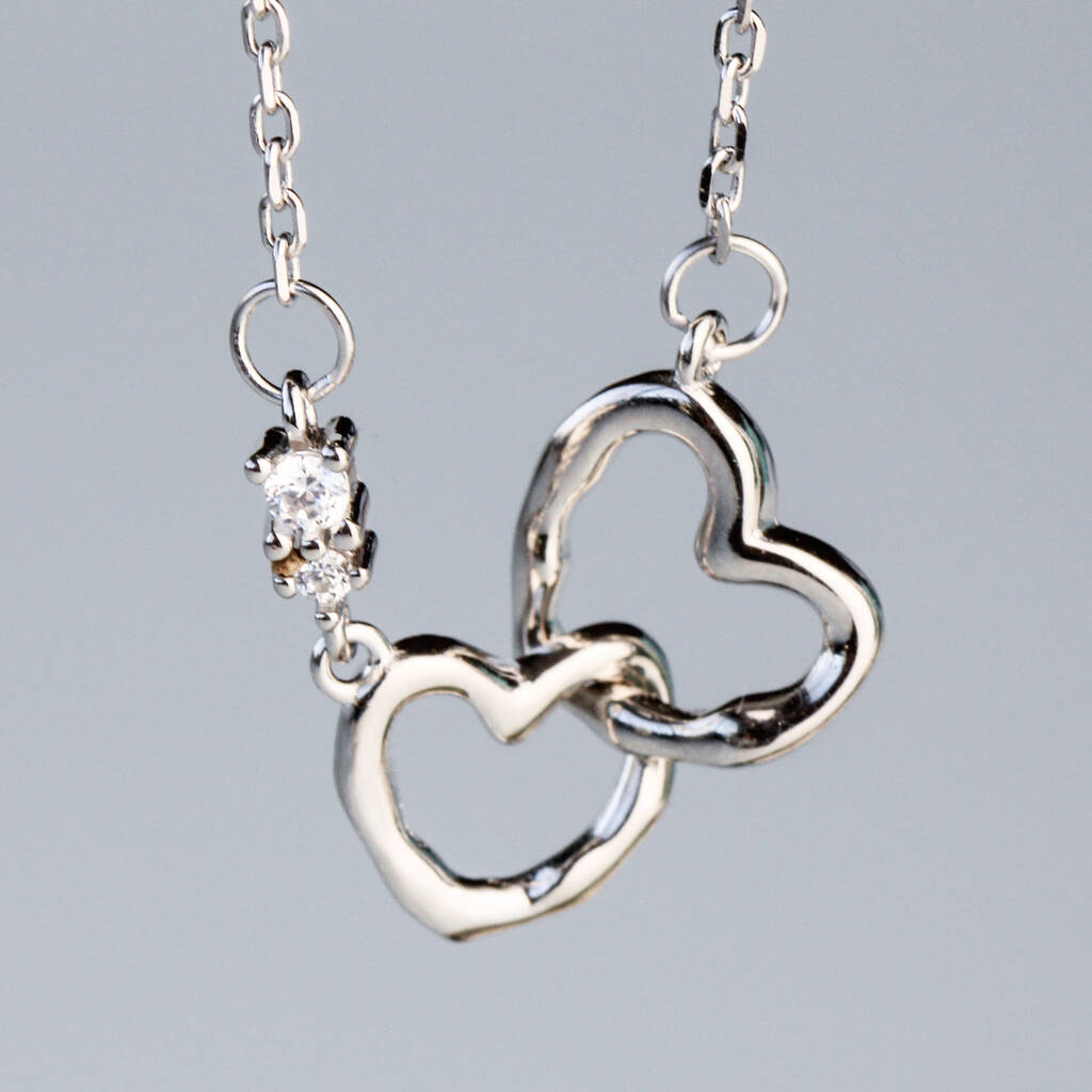 This short chain necklace is made of quality sterling silver and has a spring ring fastening. It features two small interlocking hearts with tiny white crystals.
