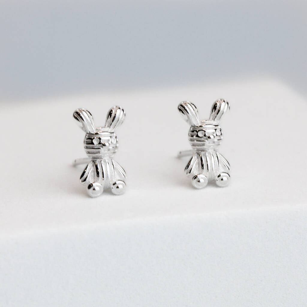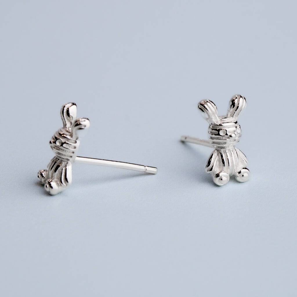 These dainty stud earrings are made of quality sterling silver and come with butterfly backs. They feature a tiny bunny rabbit with engraved stripes to mimick a knitted yarn texture.