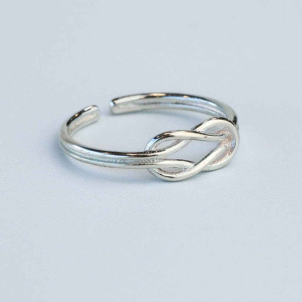 This simple ring is made of quality sterling silver and can be gently adjusted for a better fit. It features a thin band with a square knot design in the centre.