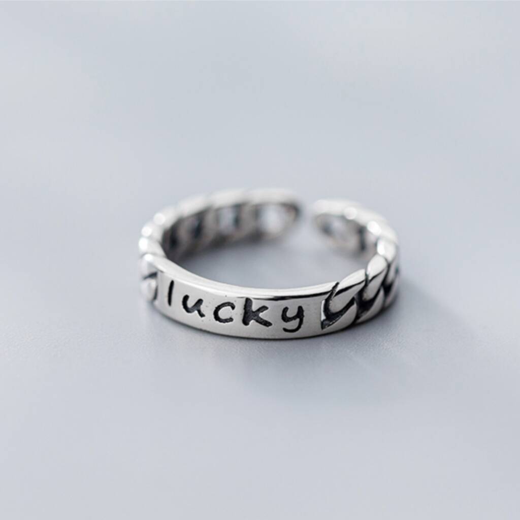 This dainty ring is made of quality sterling silver and can be gently adjusted for a better fit. It features a chain design band with the word 'lucky' engraved in the centre.