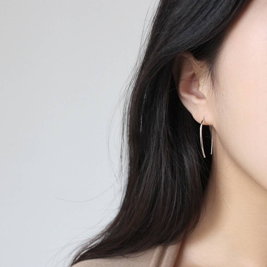 These delicate earrings are made of quality sterling silver. They feature a thin wire design which widens at the front and hangs though the front and back of the piercing.