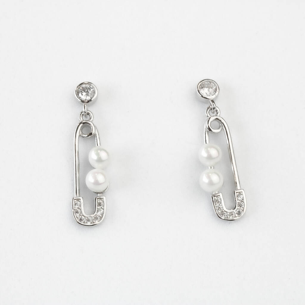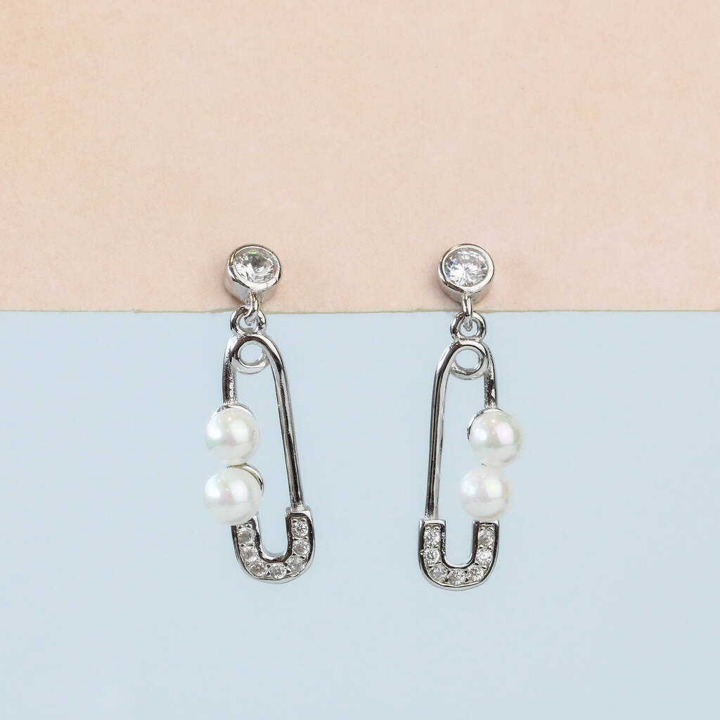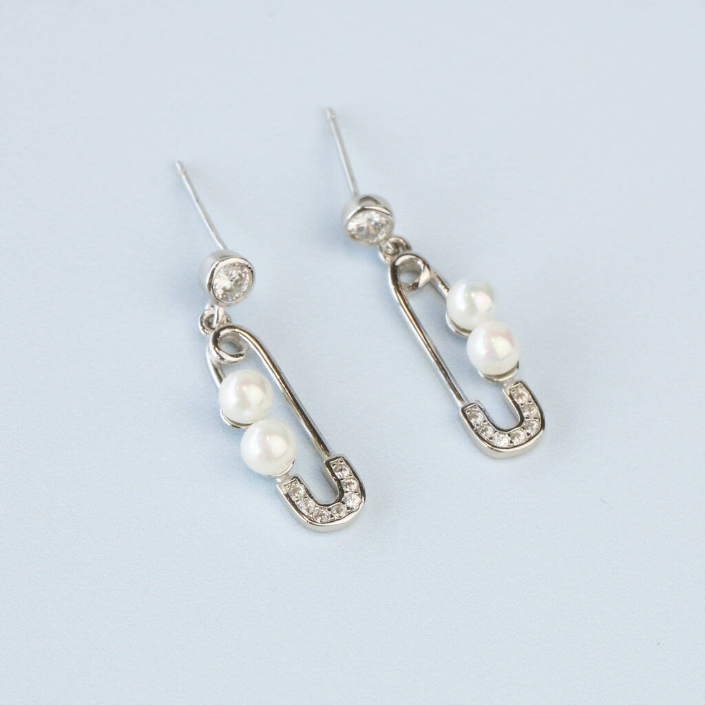 Sterling Silver Pearl Safety Pin Dangle Stud Earrings