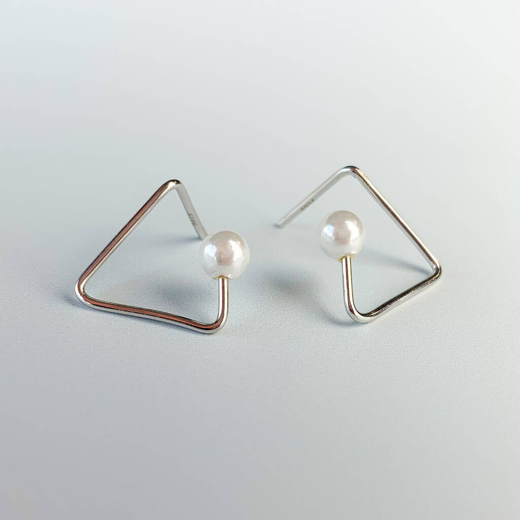 These drop stud earrings are made of quality sterling silver and come with rubber backs. They feature a single bar which hangs in a triangle shape below the ear lobe and has a round pearl at the end.