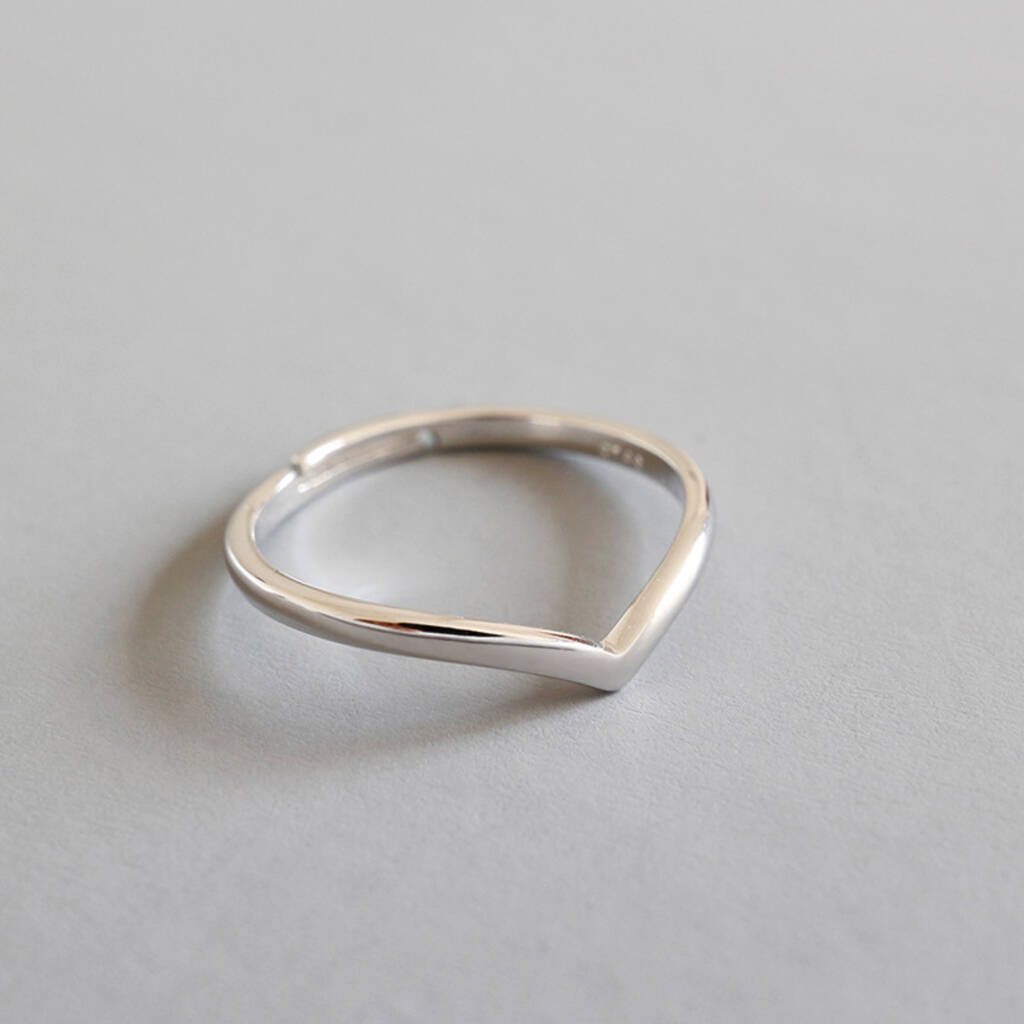 This elegant ring is made of quality sterling silver and can be gently adjusted for a better fit. It features a simple flat band which points into a chevron shape.