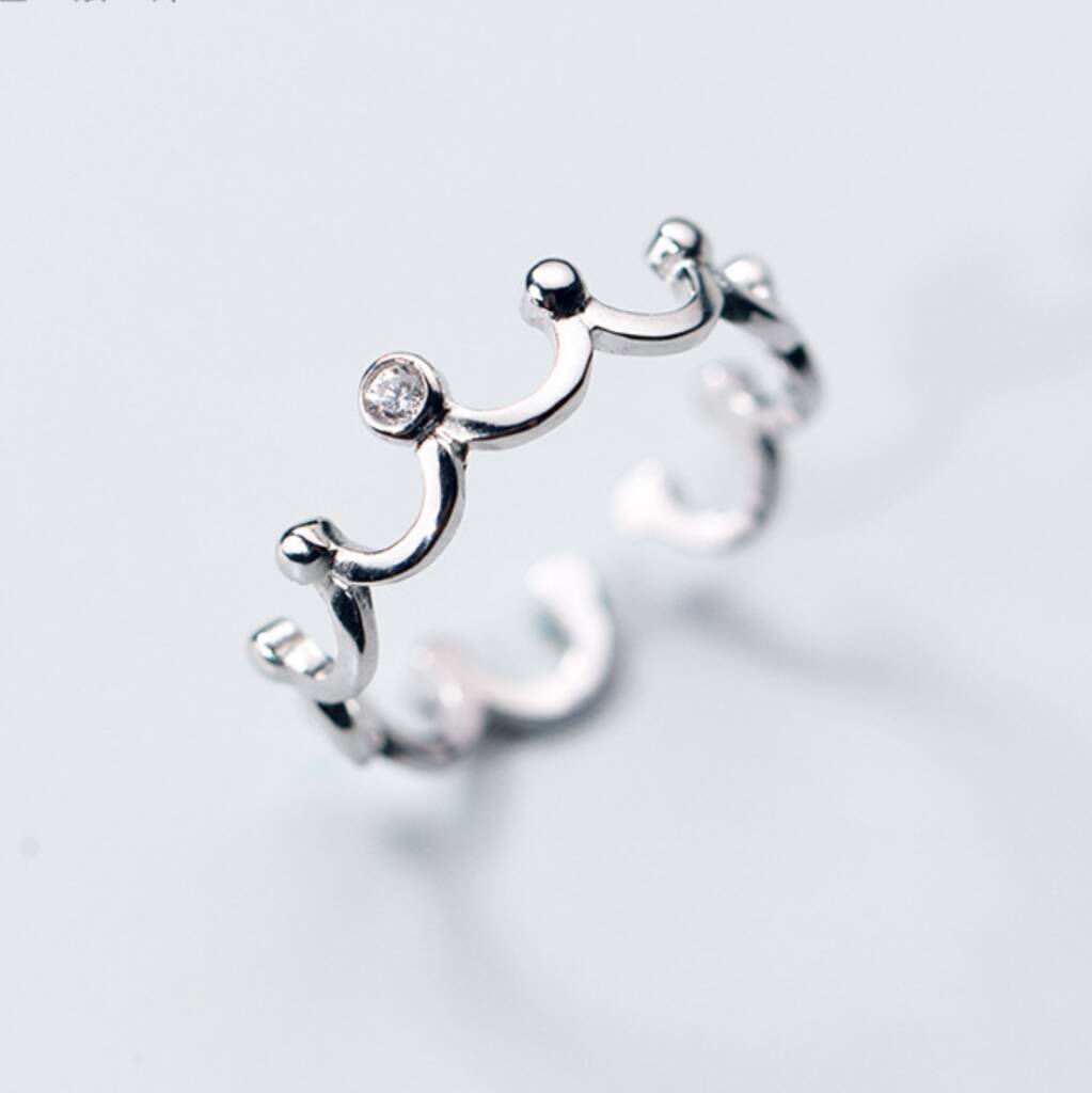 This delicate ring is made of quality sterling silver and can be gently adjusted for a better fit. It features a simple tiara design with a tiny white crystal at the front.