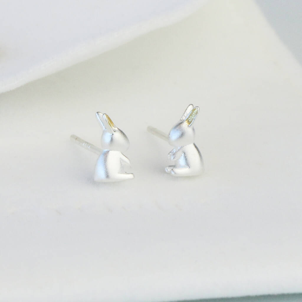 These tiny stud earrings are made of quality sterling silver with a matte finish and come with butterfly backs. They feature a simple bunny rabbit design with gold colour details on the ears.