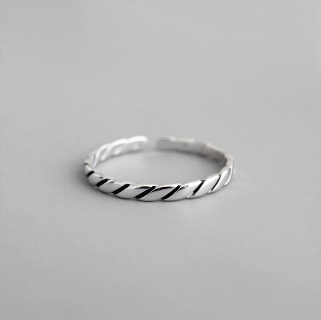 This minimalist ring is made of quality sterling silver and can be gently adjusted for a better fit. It features engraved diagonal lines to give a rope twist effect.