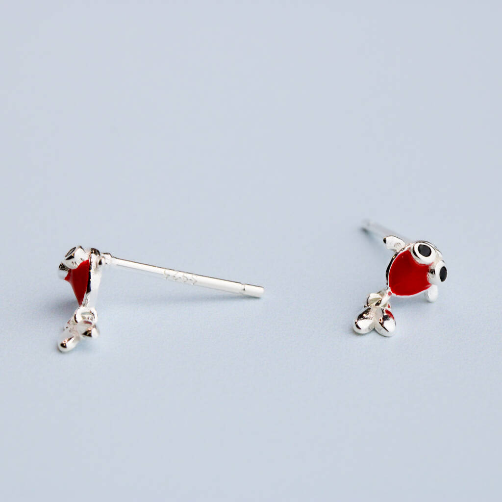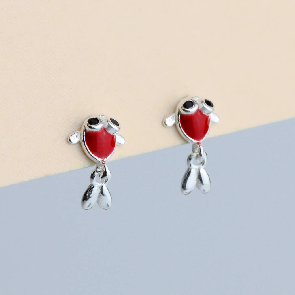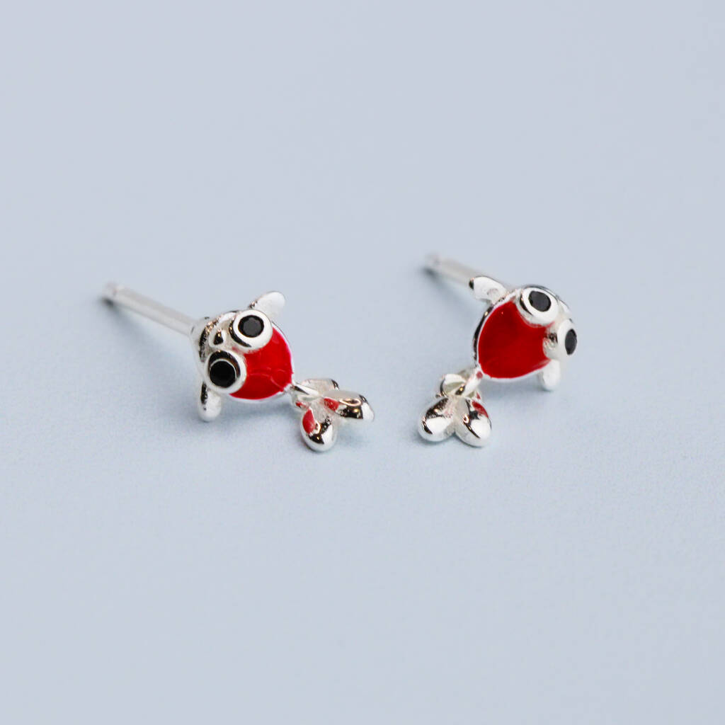 These fun stud earrings are made of quality sterling silver and come with butterfly backs. The feature a tiny orange koi fish with a dangling silver tail.