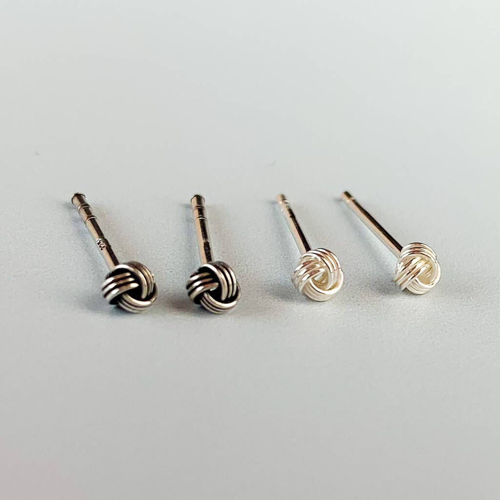 These dainty stud earrings are made of quality sterling silver and come with butterfly backs. They feature a very small knotted rope design.