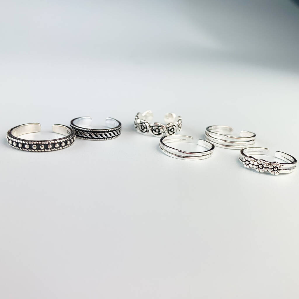 These simple rings are made of quality sterling silver and can be gently adjusted for a better fit. The various designs feature engraved details and flower shapes.