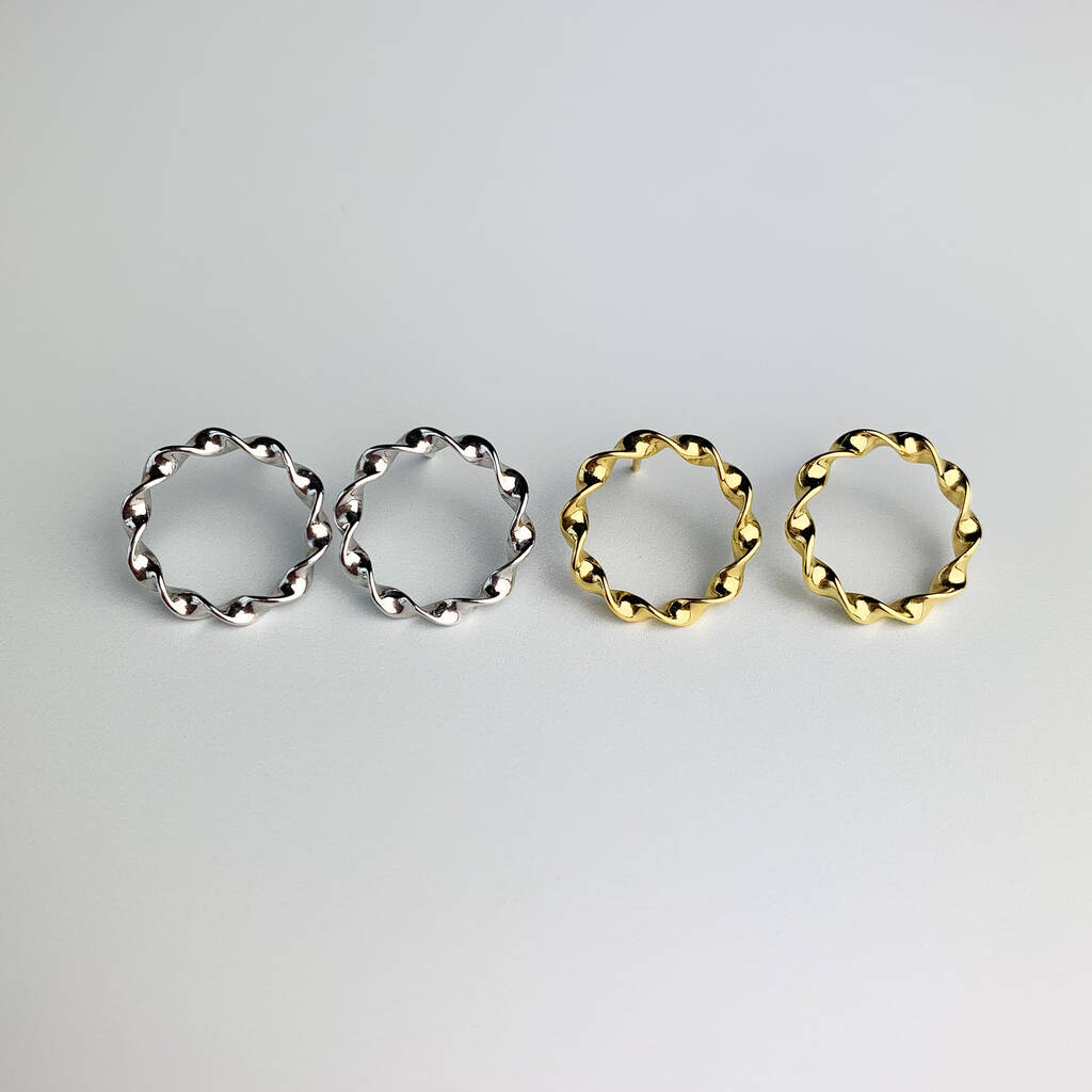 These simple stud earrings are made of quality sterling silver and come with butterfly backs. They feature a twisted circle outline.