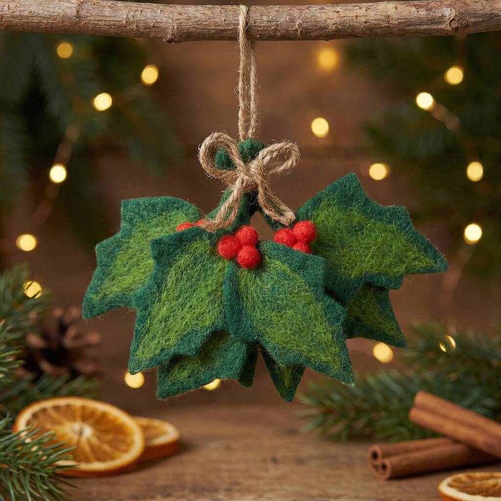 A festive bunch of vibrant green, wet felted Holly leaves tied together in a sprig with natural string.