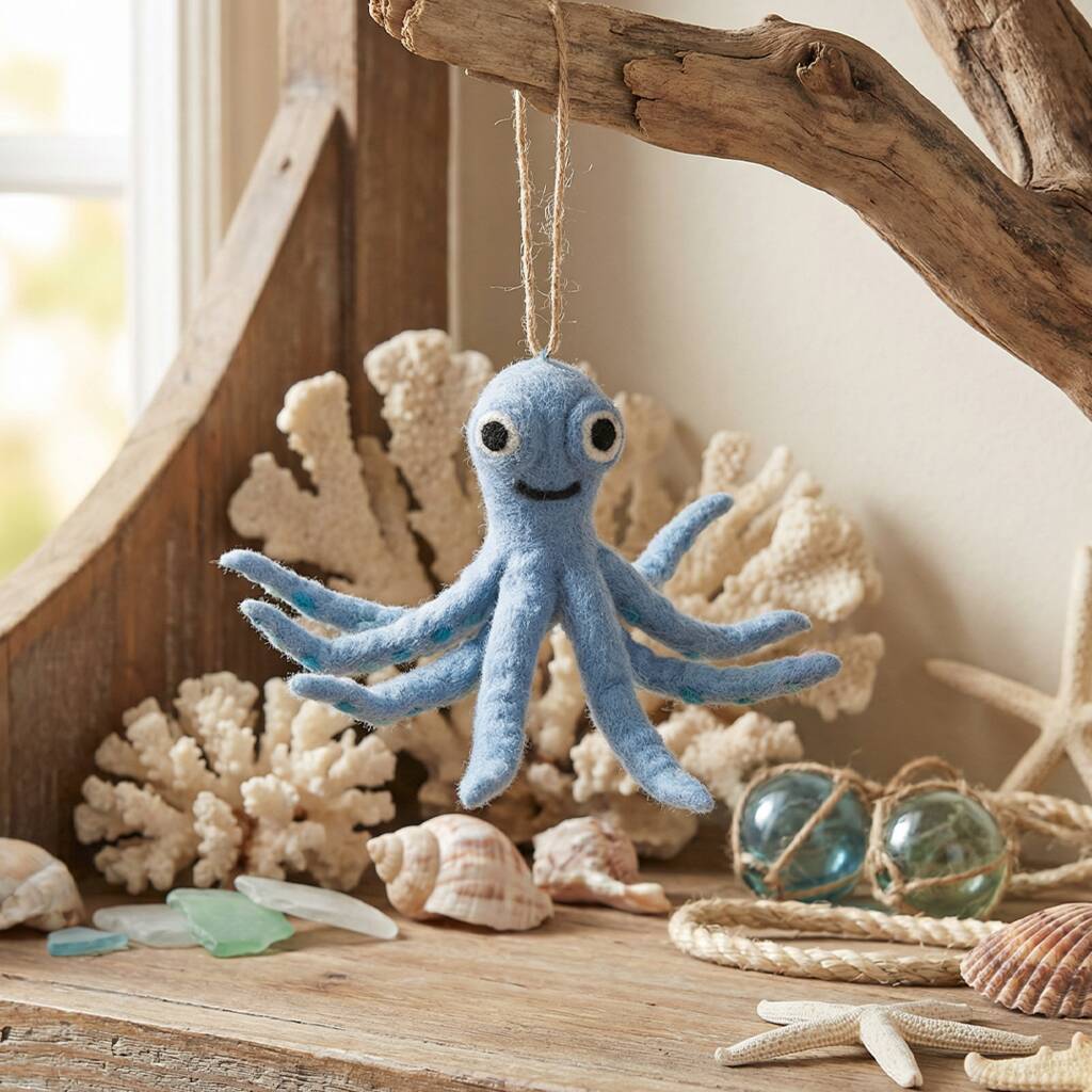 Ollie can stand alone, or hang as part of your quirky sealife display! Each tentacle has it's own needle felting detailing, making this octopus a truly beautiful work of art.