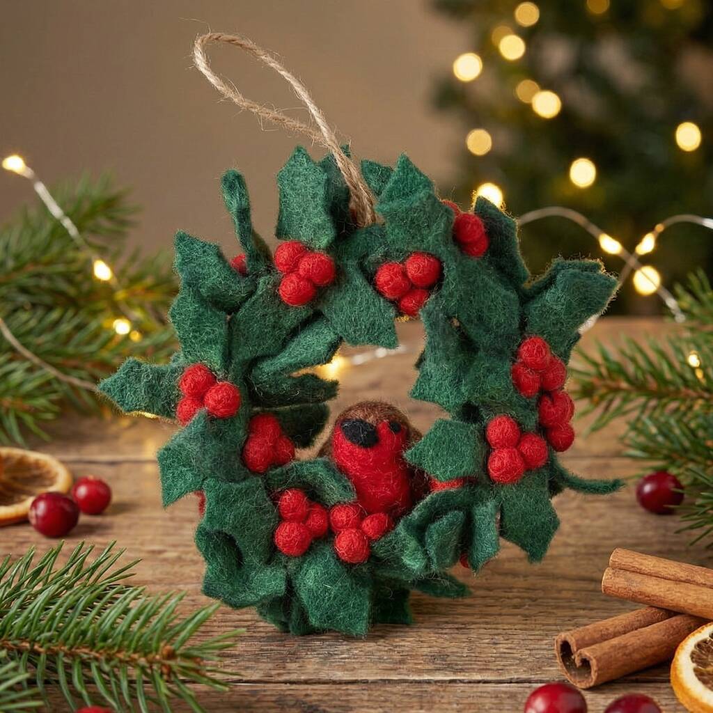Made entirely from wet felting techniques using biodegradable and sustainable materials, with one adorable needle felted robin perched on the wreath.