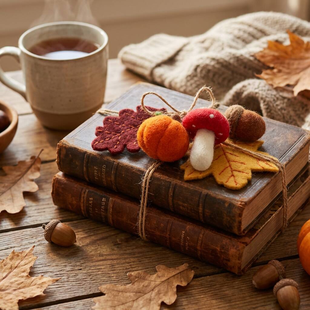 Pumpkin H4cm x W4cm, Toadstool H6cm x W4cm, Yellow Leaf H7.5cm x W7.5cm, Red Leaf H8cm x W4cm, Acorn H4cm x W3cm