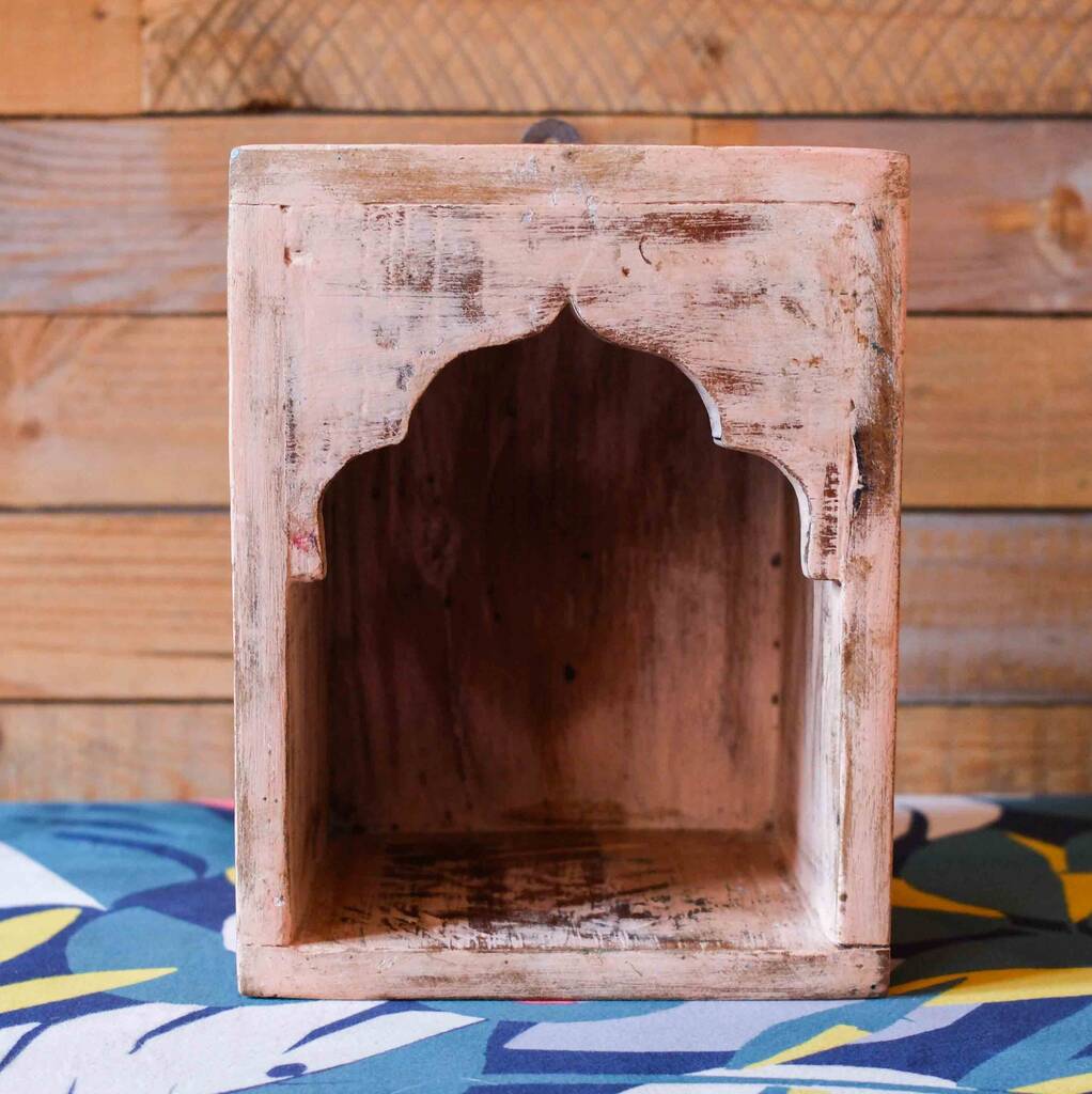 Handcrafted Indian pink arched wooden box with rustic, distressed finish. Perfect for treasures, candles, or décor, adding unique, soulful artisan charm to any space.Bring timeless heritage and artisanal charm into your home with this handcrafted Indian pink arched wooden box. Its softly distressed finish reveals layers of history, while the arched design adds subtle drama.