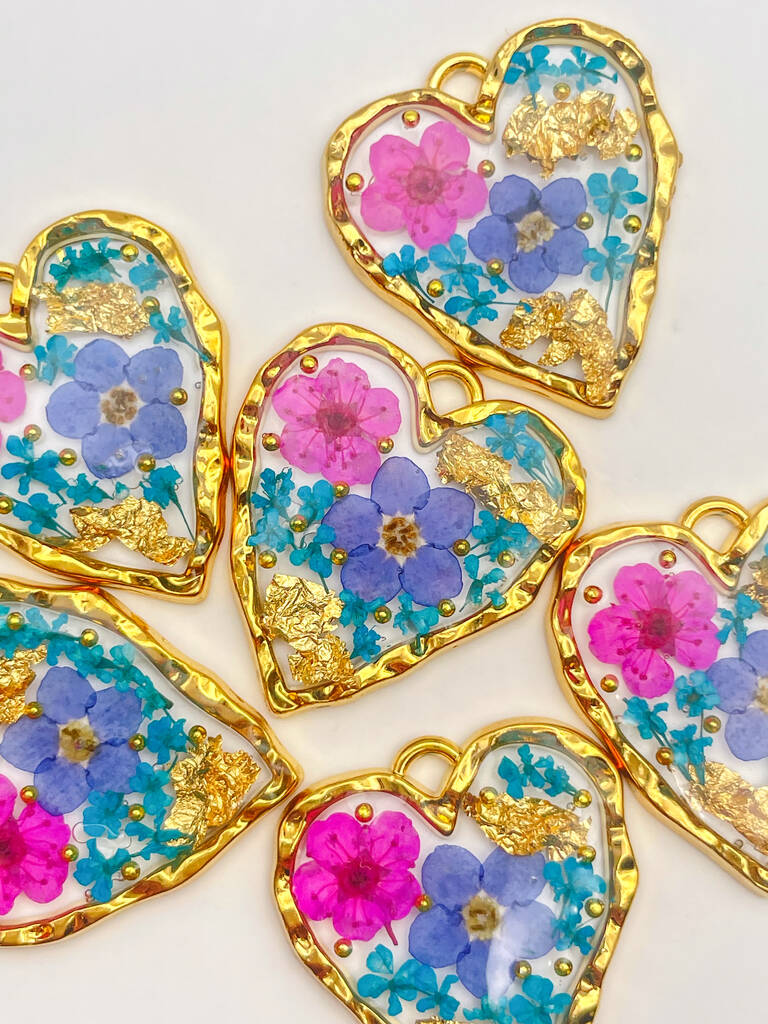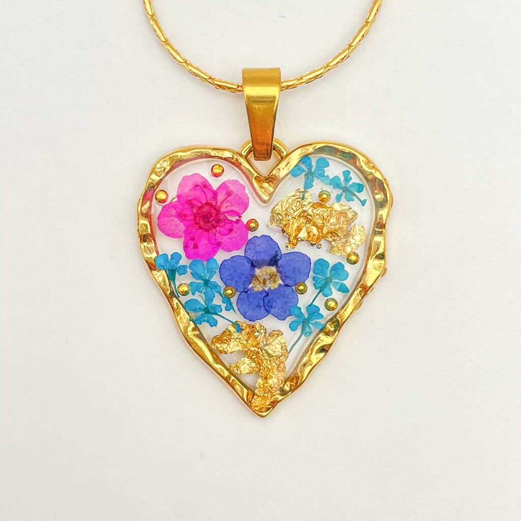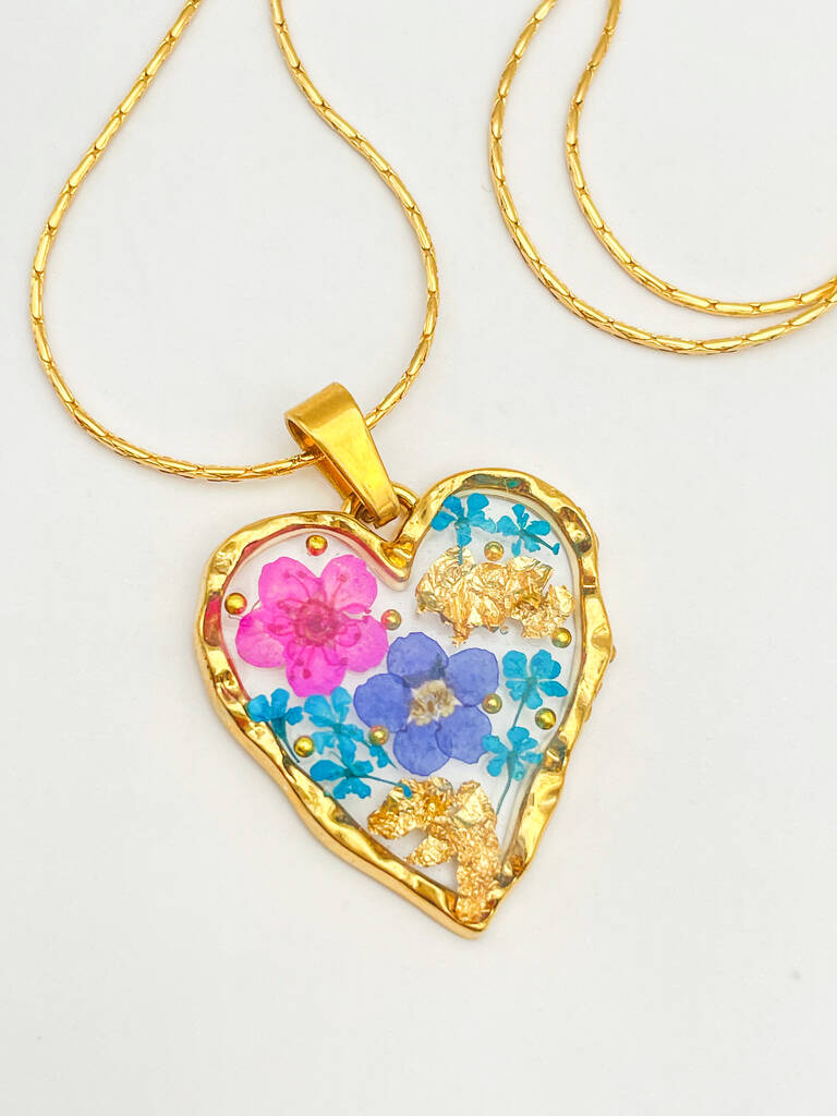 Heart Necklace With Forgetmenot And Pink Flowers