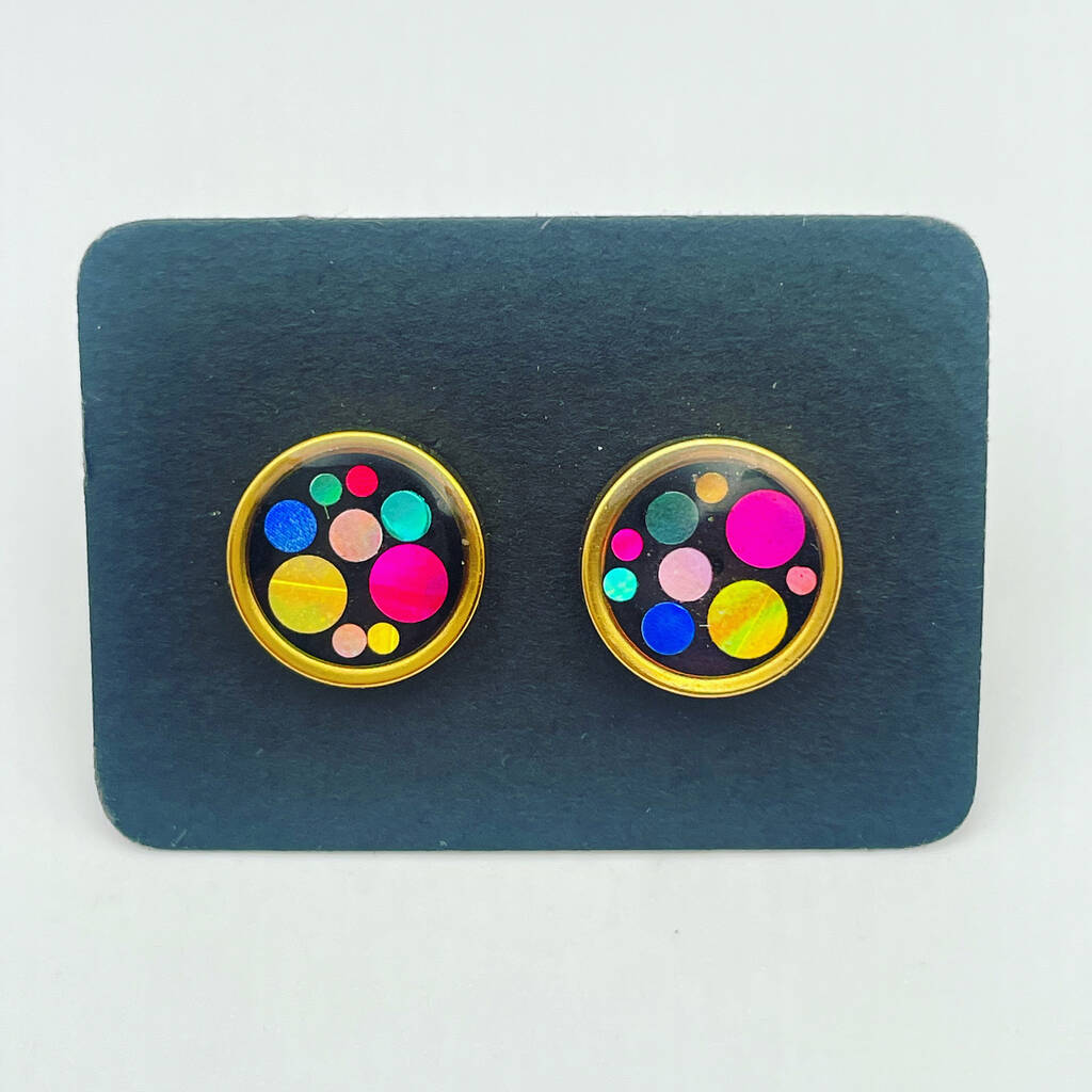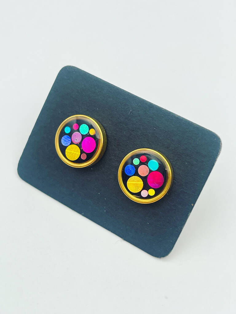 Stud earrings inspired by disco balls and handmade with colourful sparkles. Available in real gold plating or silver colour stainless steel. Waterproof and hypoallergenic.