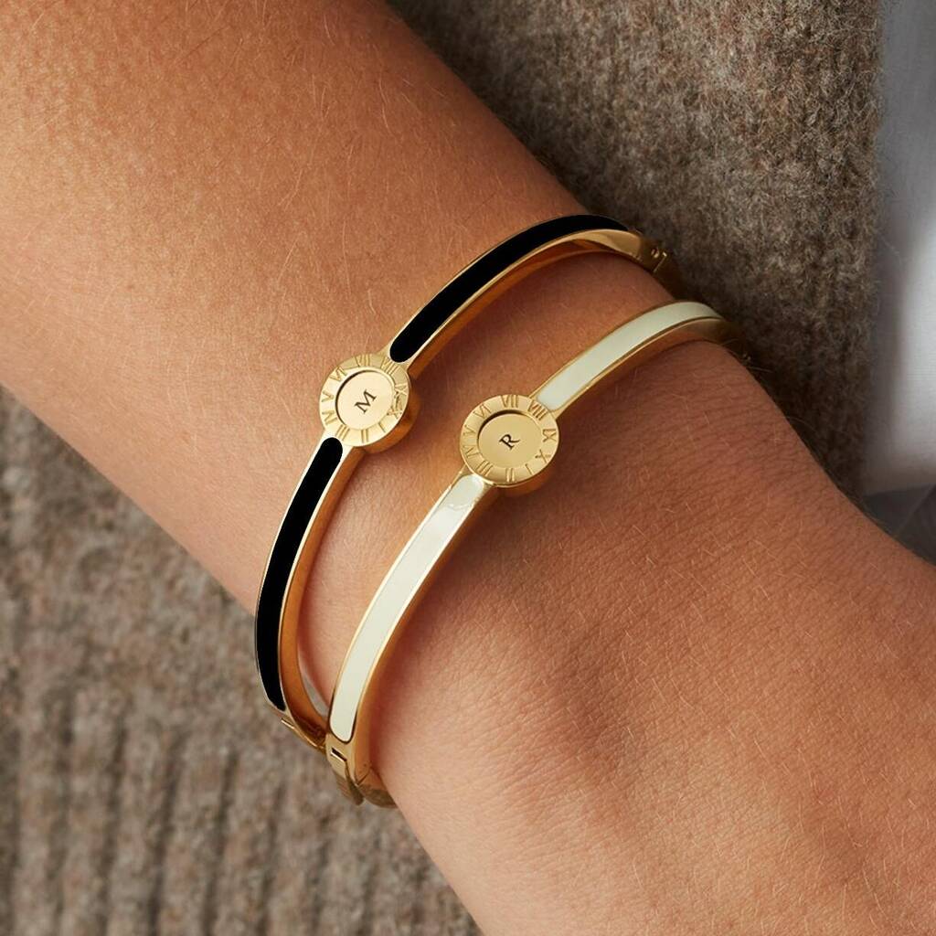 An 18ct gold plated steel Oval Clasp Enamel Bracelet featuring beautiful colours and a central pendant engraved with initial/s.