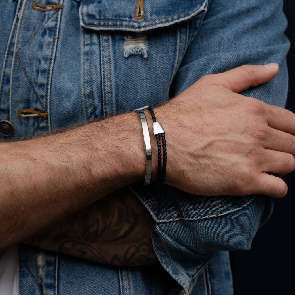 A luxurious blend of minimalist design and refined craftsmanship. This men's black leather bracelet features two 316L polished stainless steel slider clasp.