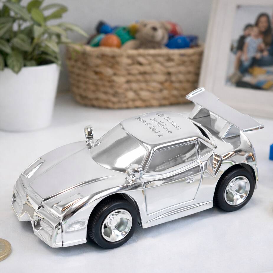 Gifts For Boys Personalised Racing Car Money Box Silver Plated
