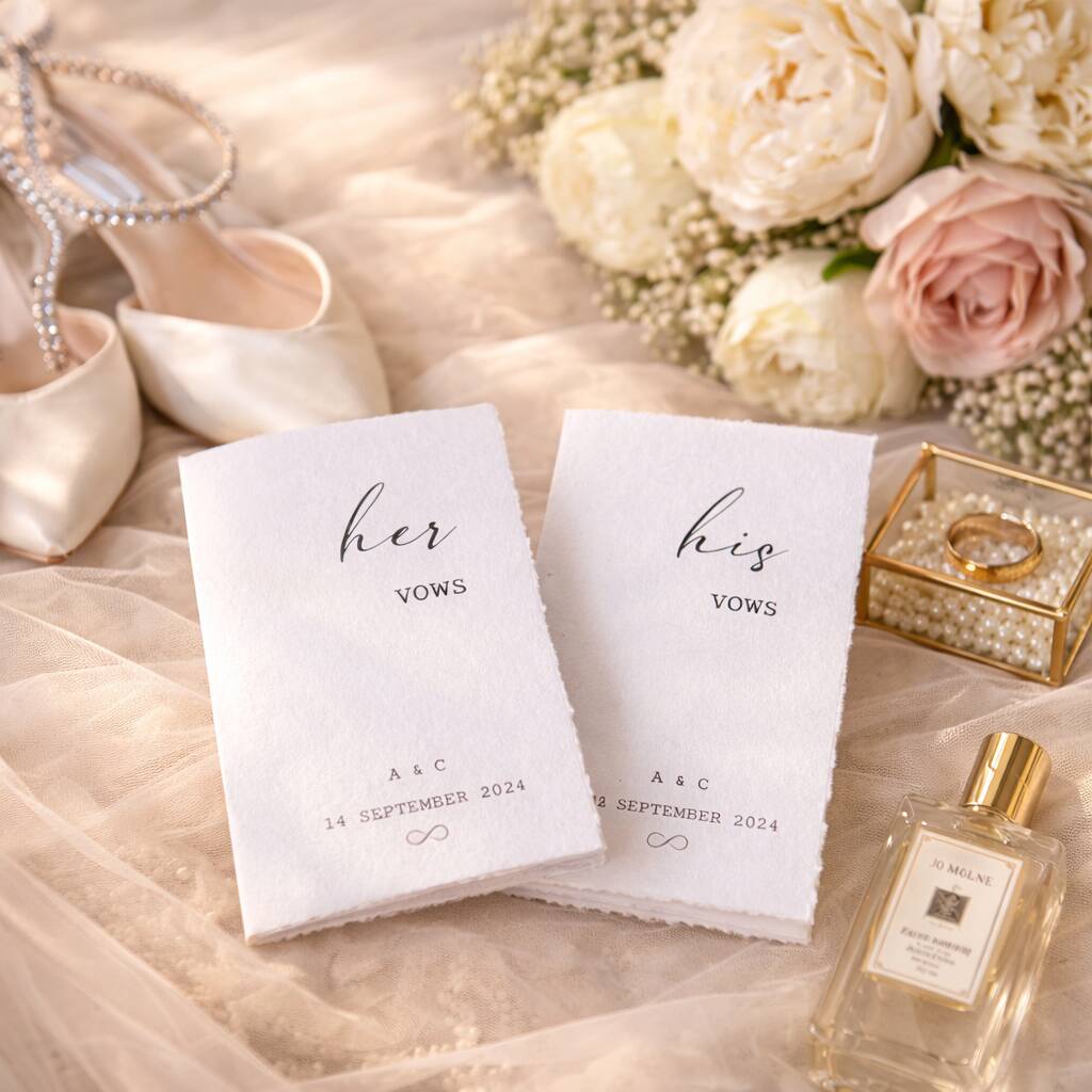 His and her wedding vow books - handmade from luxurious cotton paper. Personalised with initials and wedding date - unique reading vow cards.