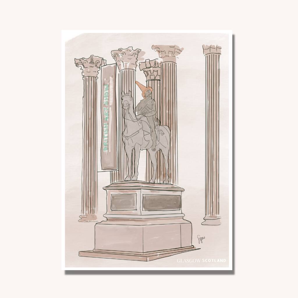 The 'Glasgow Duke of Wellington Statue: Man with Cone Hat Illustration Print'. A beautiful print bringing a sense of glasgow and elegance to your space