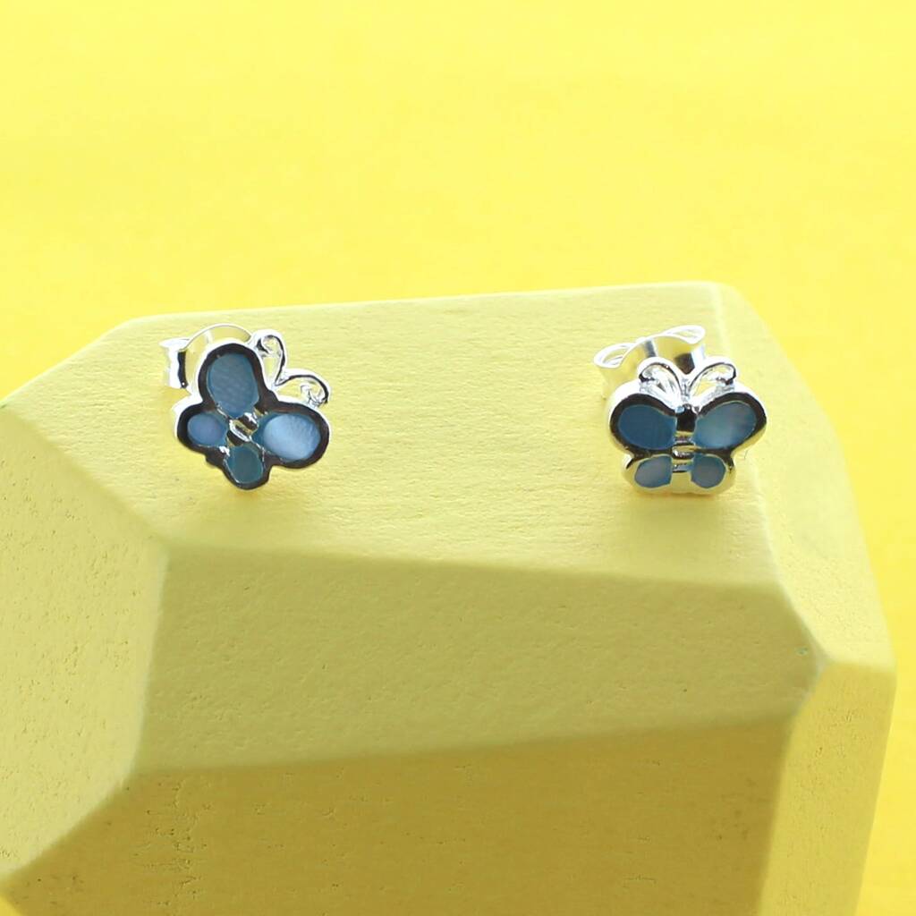 A stunning pair of sterling silver blue mother of pearl inlaid stud earrings.Delicately crafted to add a graceful, nature-inspired accent to your everyday wardrobe, these butterfly stud earrings combine lustrous blue mother of pearl with classic sterling silver for a timeless yet whimsical look.