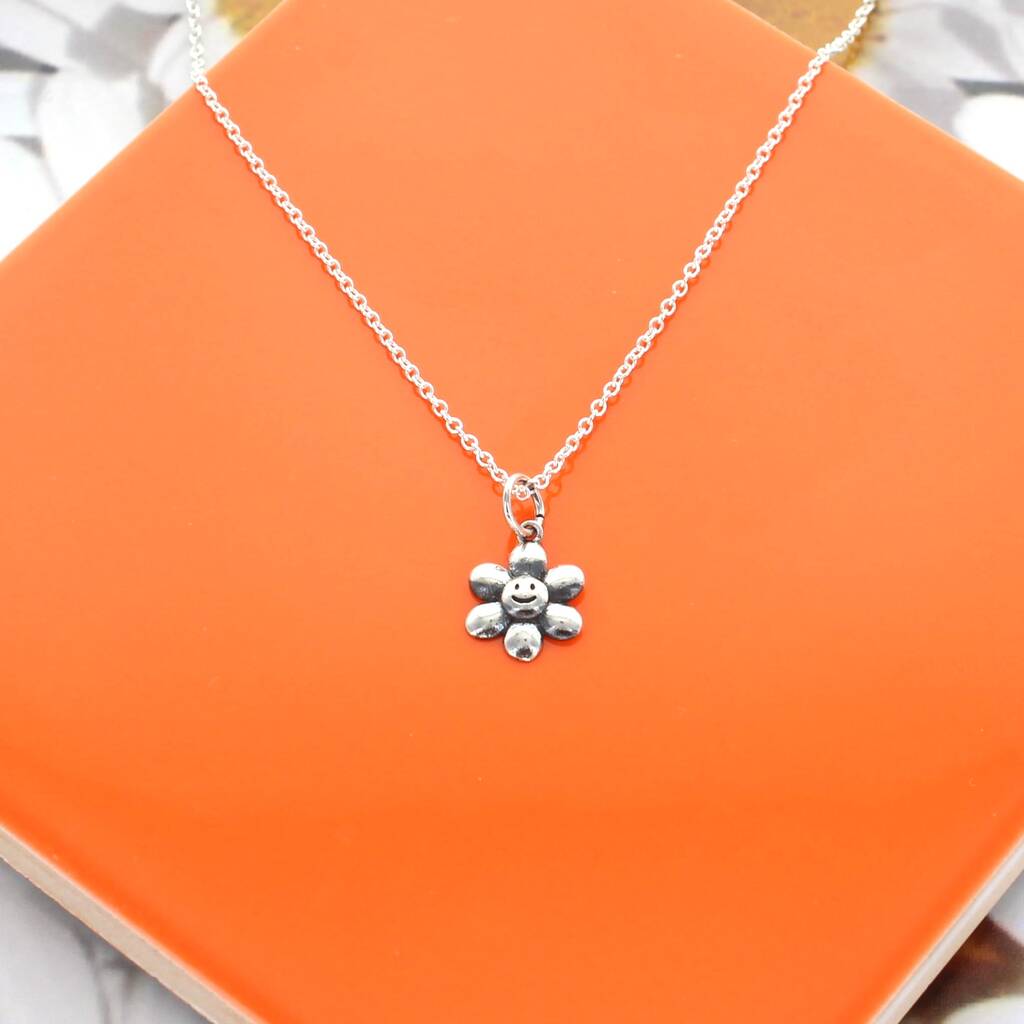 A fun sterling silver necklace with a happy face on a flower.A cheerful Happy Flower necklace designed to brighten your day. Delicate, playful, and full of positive vibes, perfect for everyday wear or gifting someone special.