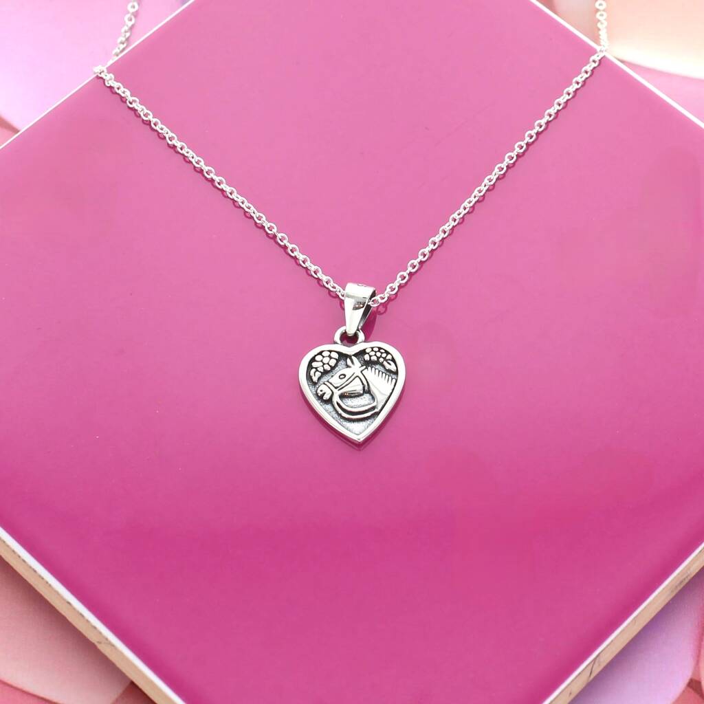 A beautiful sterling silver necklace with a heart and detailed horses head in the centre.Celebrate the bond of love and freedom with this exquisite Love Horse Charm Necklace. Featuring a delicately crafted horse charm symbolizing strength, grace, and loyalty, this necklace is a perfect reminder of passion and connection. Suspended from a fine, adjustable chain, the charm catches the light beautifully, making it ideal for everyday wear or special occasions. A thoughtful gift for horse lovers or anyone who cherishes the spirit of love and adventure.