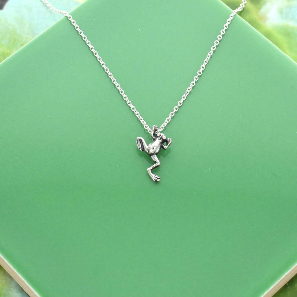 A cute sterling silver necklace with a little climbing frog.A charming ode to nature’s little adventurers, this petite climbing frog necklace features a finely detailed frog motif in lustrous sterling silver. The design captures the joyful spirit and subtle movement of a frog mid‑climb, making it a whimsical and eye‑catching accent. Crafted from high‑quality sterling silver with a smooth, polished finish, the frog pendant sits comfortably on a delicate chain, ideal for everyday wear or as a thoughtful gift for animal lovers.