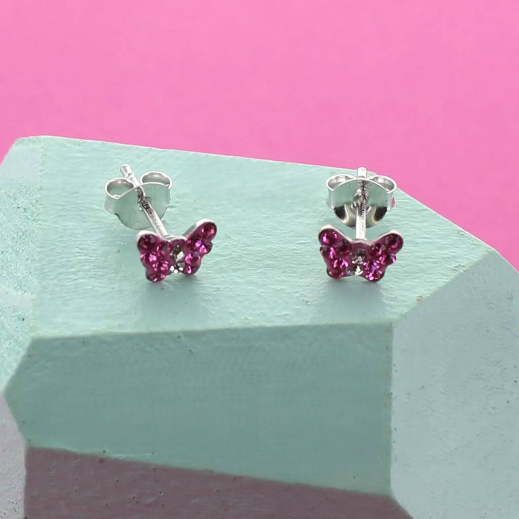 A cute pair of sparkly sterling silver and pink crystal stud earringsDelicately crafted for everyday wear, the petite butterfly stud earrings combine classic elegance with a touch of feminine sparkle. Made from 925 sterling silver, each earring features a beautifully shaped butterfly motif accented with shimmering pink crystal stones that catch the light with every turn. The soft pink hue of the zircon adds a gentle, romantic pop of colour, perfect for adding subtle charm to both casual and dressy outfits.