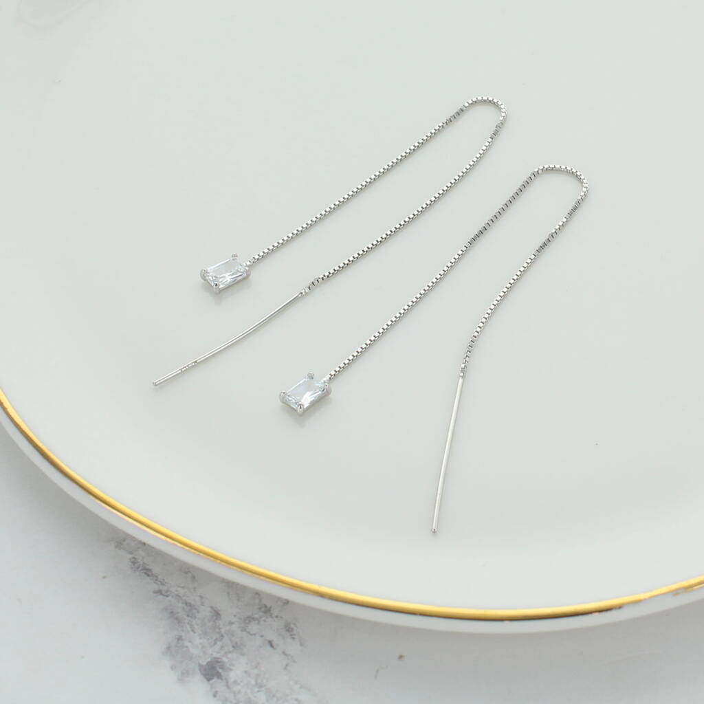 A stunning pair of Emerald cut cubic zirconia pull through earrings.Crafted for modern sophistication, these stunning threader earrings feature sleek rectangular zircon stones set in lustrous sterling silver. The clear, precision-cut zircon gems catch the light beautifully, offering the sparkle of fine gemstones with exceptional clarity and brilliance.