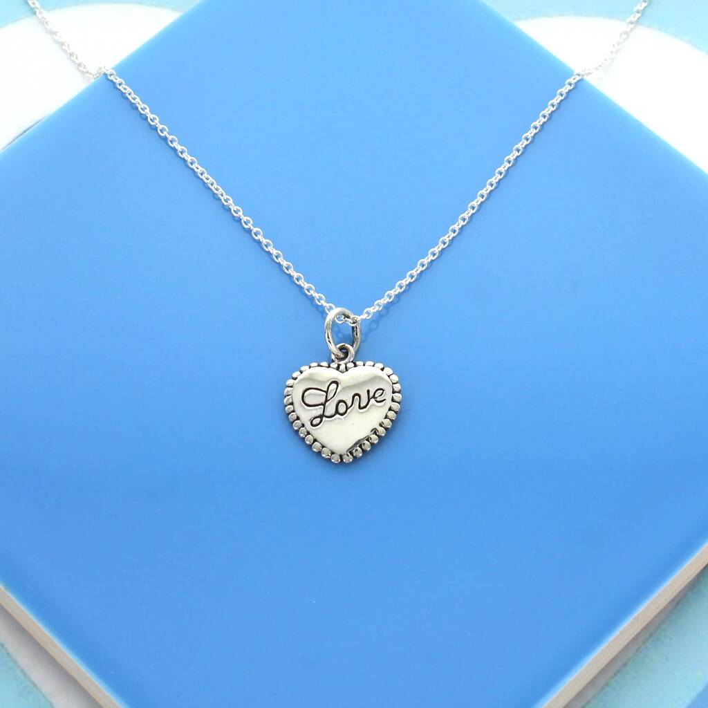 A beautiful sterling silver necklace with a simple retro style heart with the word love engraved.Capture timeless romance with this Retro Love Word Charm Necklace, a perfect blend of nostalgic charm and modern elegance. Crafted in high‑quality sterling silver, the gracefully scripted “Love” word charm sits suspended from a fine silver chain, casting a soft shimmer with every movement.